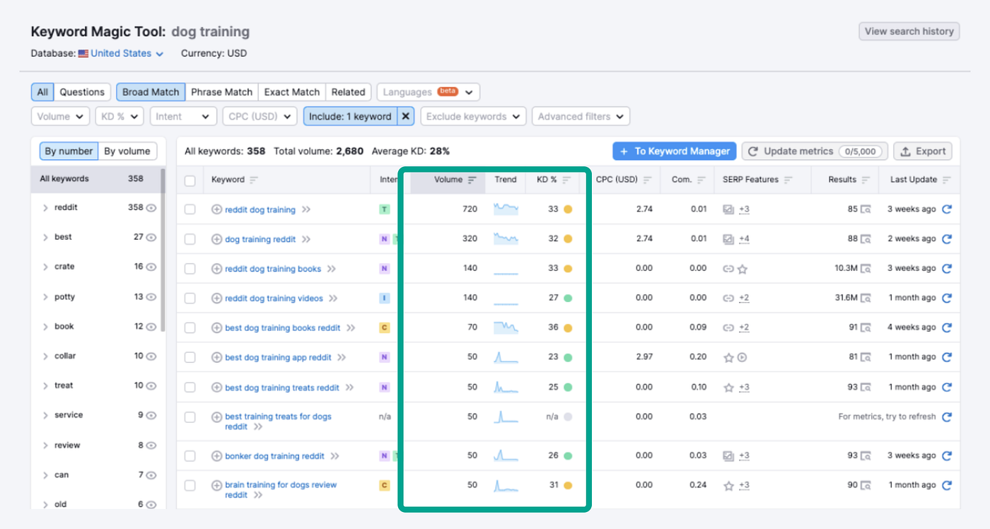 The sweet spot is keywords with high volume and low difficulty. These are your best bets for ranking quickly. You don’t see them often, unfortunately.