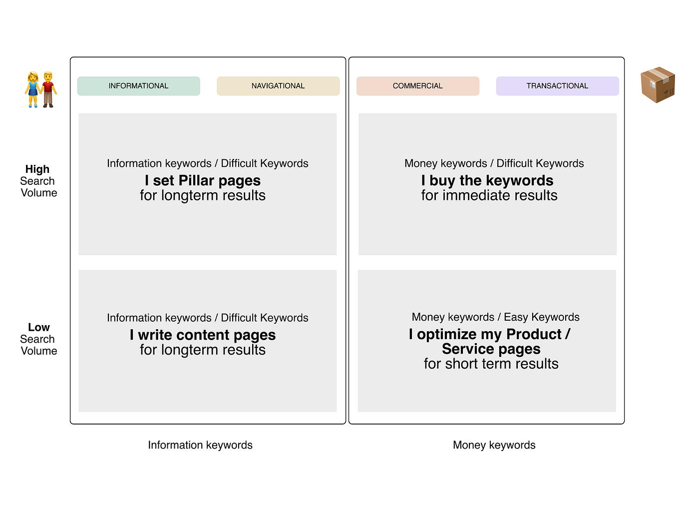 Top-right (Money keywords / High volume) -> Landing pages “I buy the keywords for immediate results”