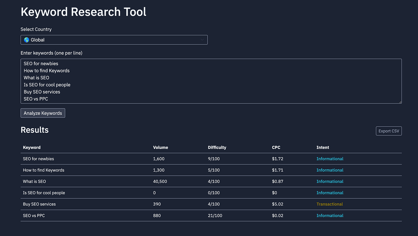 You can copy/paste your chatGPT list of keywords into the text input, choose your country of analysis, and click “Analyse Keywords.”