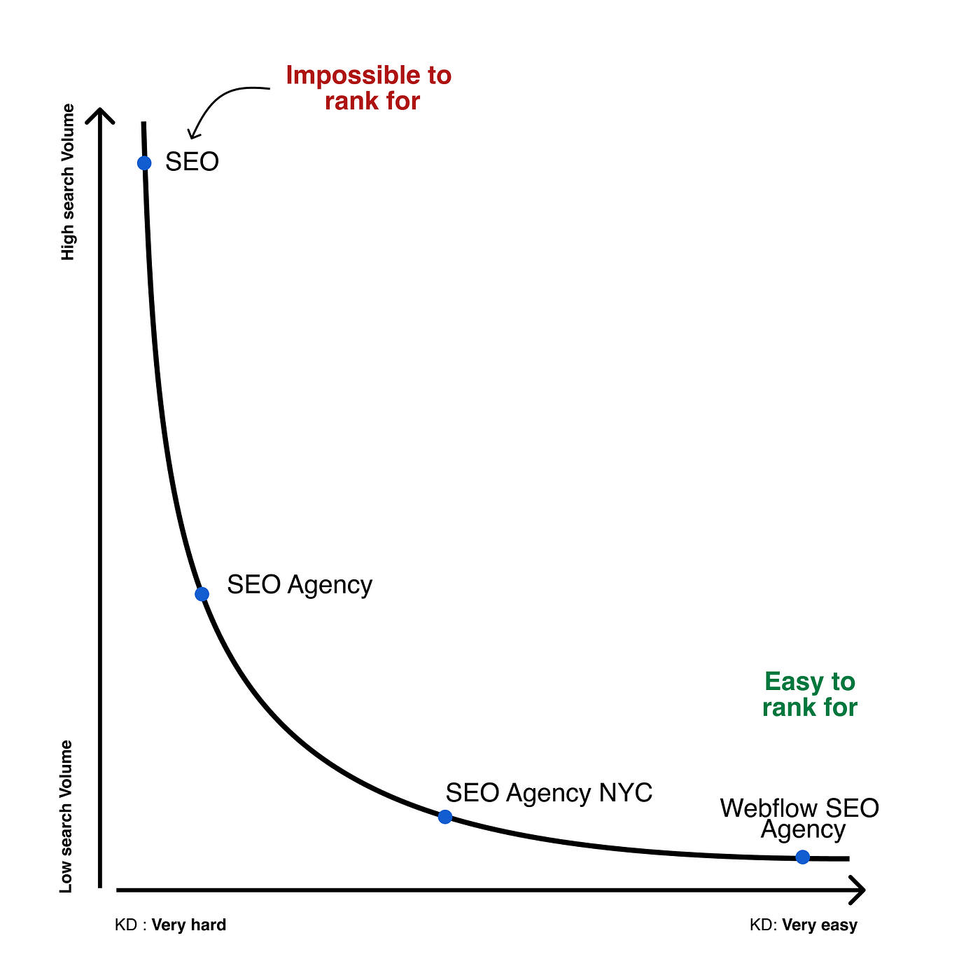 For example, let’s look at some search queries in the USA: SEO agency: KD= 74 (very difficult) and SV = 27 000 (high search volume) Webflow SEO agency: KD = 6 (very easy) and SV = 30 (low search volume)